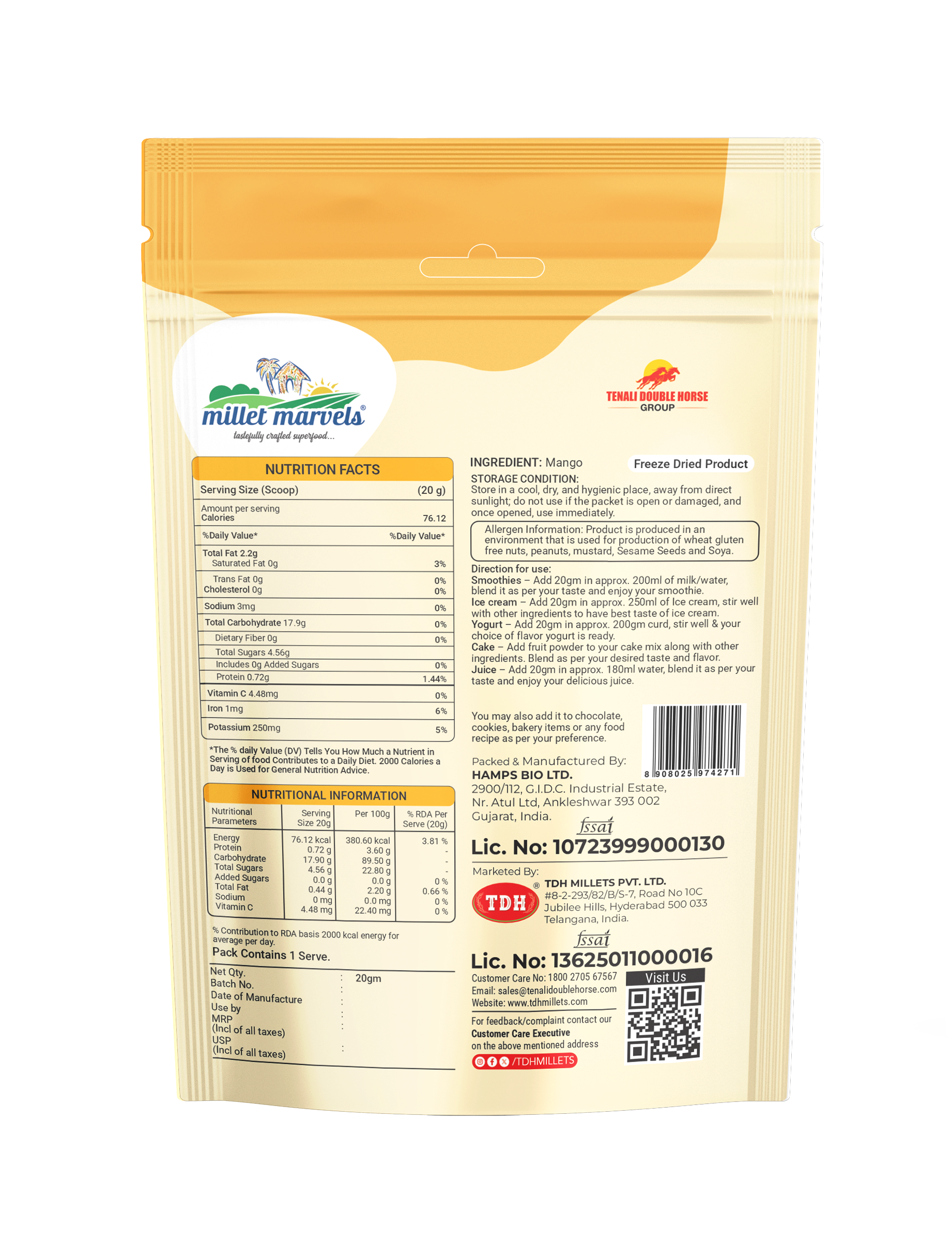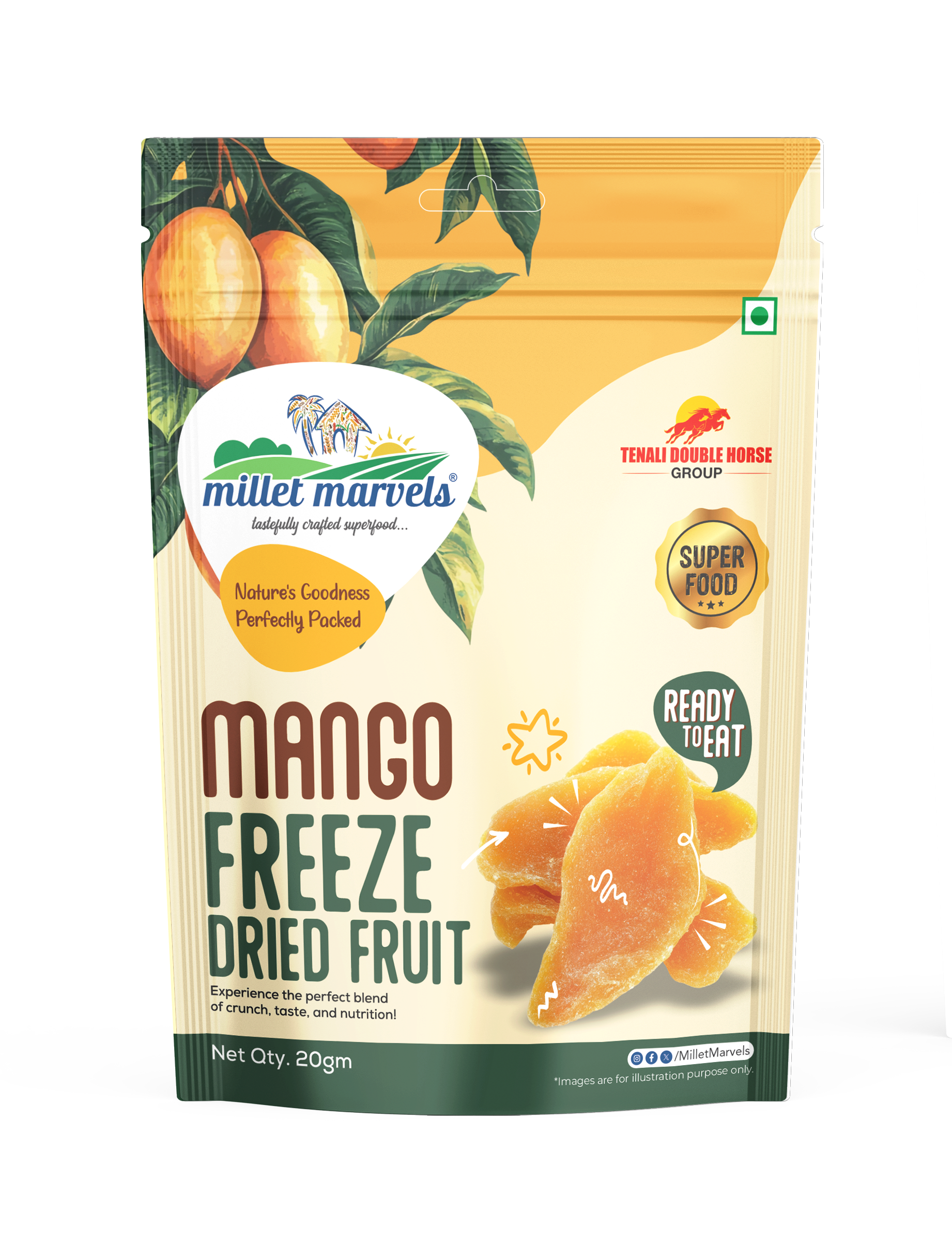 Mango Freeze Dried Fruit by Millet Marvels (TDH Group) is made from hand-selected ripe mangoes using advanced freeze-drying technology to preserve their natural taste, color, shape, and nutrients.