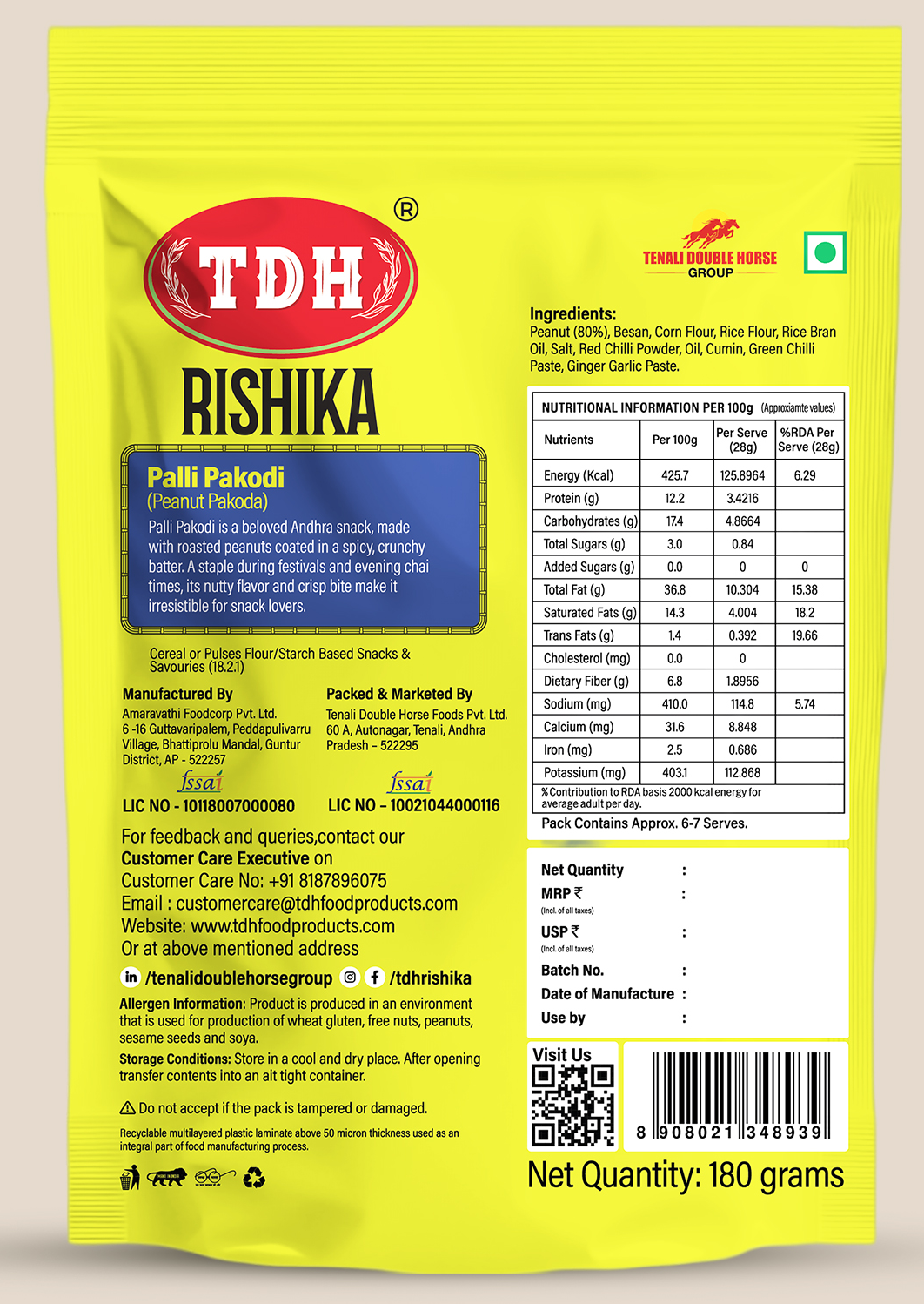 Palli Pokodi is a flavourful and crunchy traditional South Indian snack made with premium peanuts coated in a spicy gram flour batter and fried to a crispy, golden finish. Each bite offers a perfect blend of nutty richness, bold spices, and satisfying crunch, making it a favourite snack for all ages.