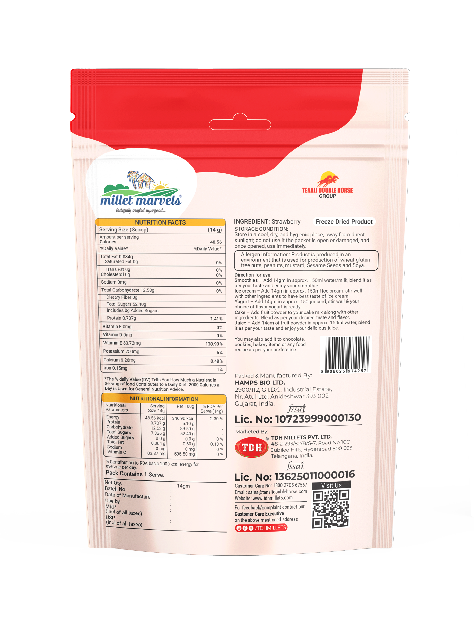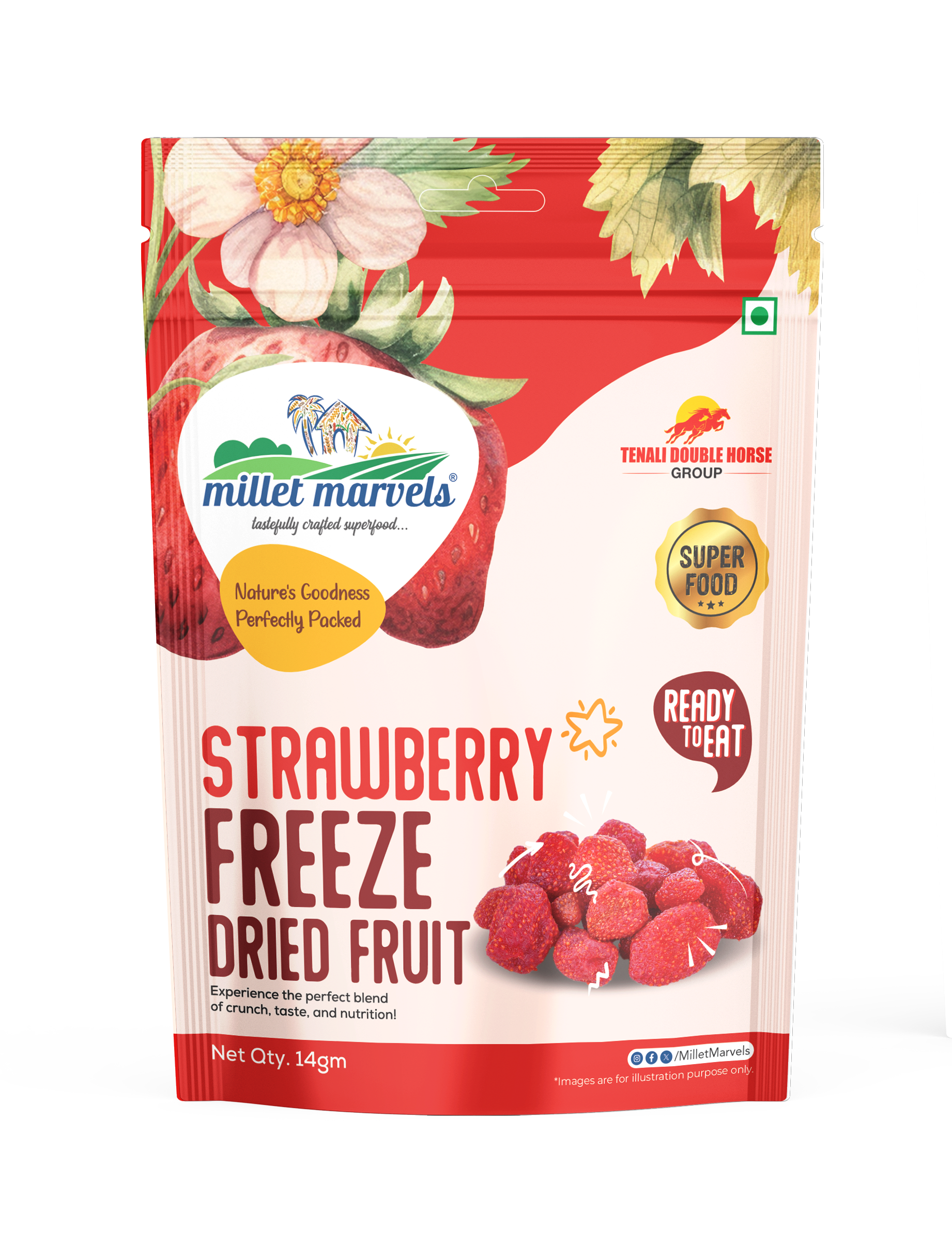Strawberry Freeze Dried Fruit by Millet Marvels (TDH Group) is made from premium quality strawberries using advanced freeze-drying technology that preserves natural flavor, color, shape, and nutrients.